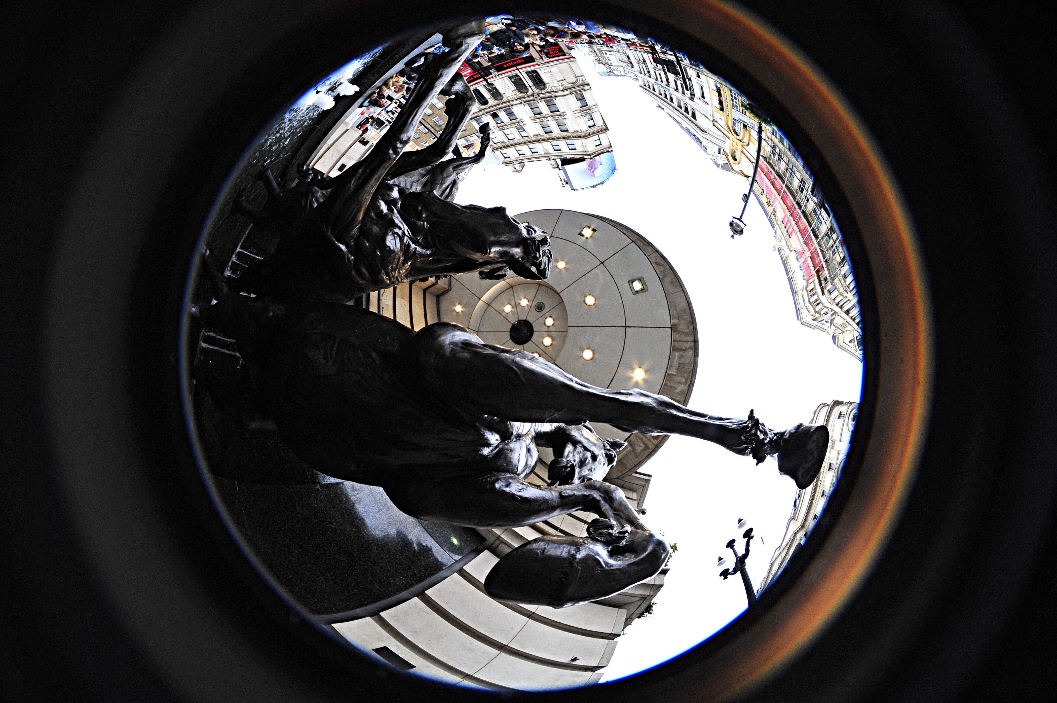 A rather disconcerting fisheye view of a statue