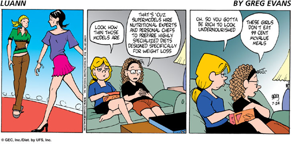 | The title is a somewhat irrelevant reference to Langland's Piers the Plowman. I hope that's not too obvious and that it doesn't build up too many expectations of a homiletic nature. 1 Luann "...the ideal gets ... slenderer" By a strange coincidence this cartoon appeared the same week as I wroke my essay | | | 1 If not the actual boob. 2 Ay me! "... the words 'Ay me!'" Shakespeare's (or Bacon's if you still insist on being like that) R&J.II.ii line 28ish.